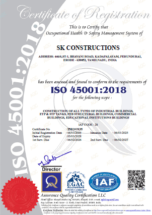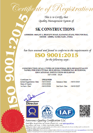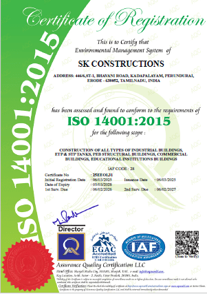 SK Construction is a leading industrial construction company based in Tamil Nadu, delivering high-quality construction solutions across India. With over 25+ years of experience, we specialize in industrial, commercial, and institutional projects. Our commitment to innovation, quality, and client satisfaction has helped us build long-lasting relationships and successfully complete large-scale projects.